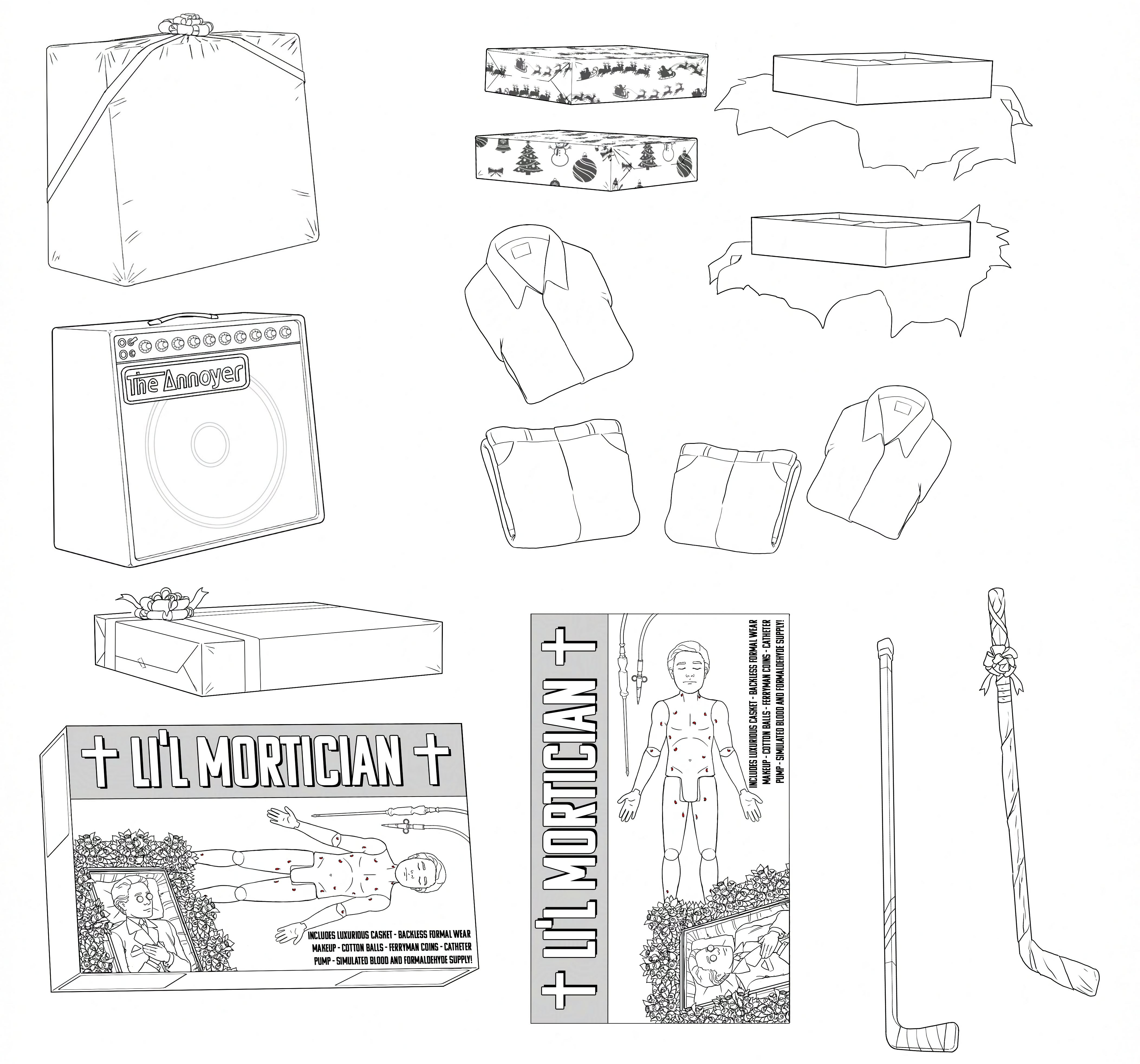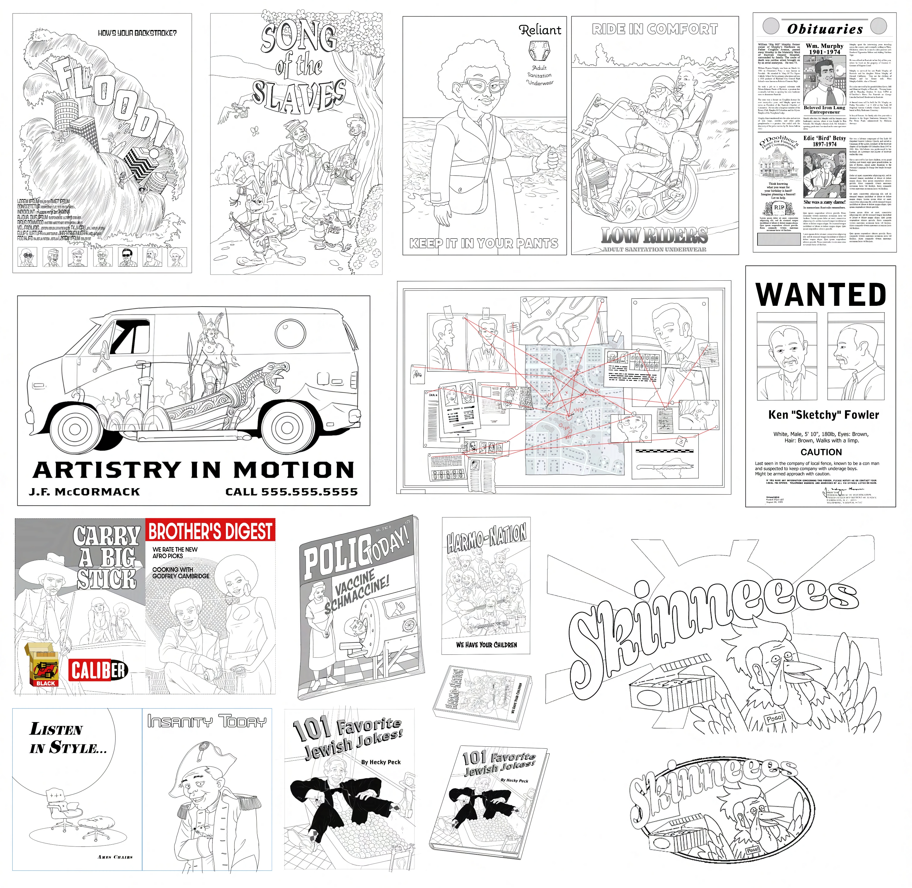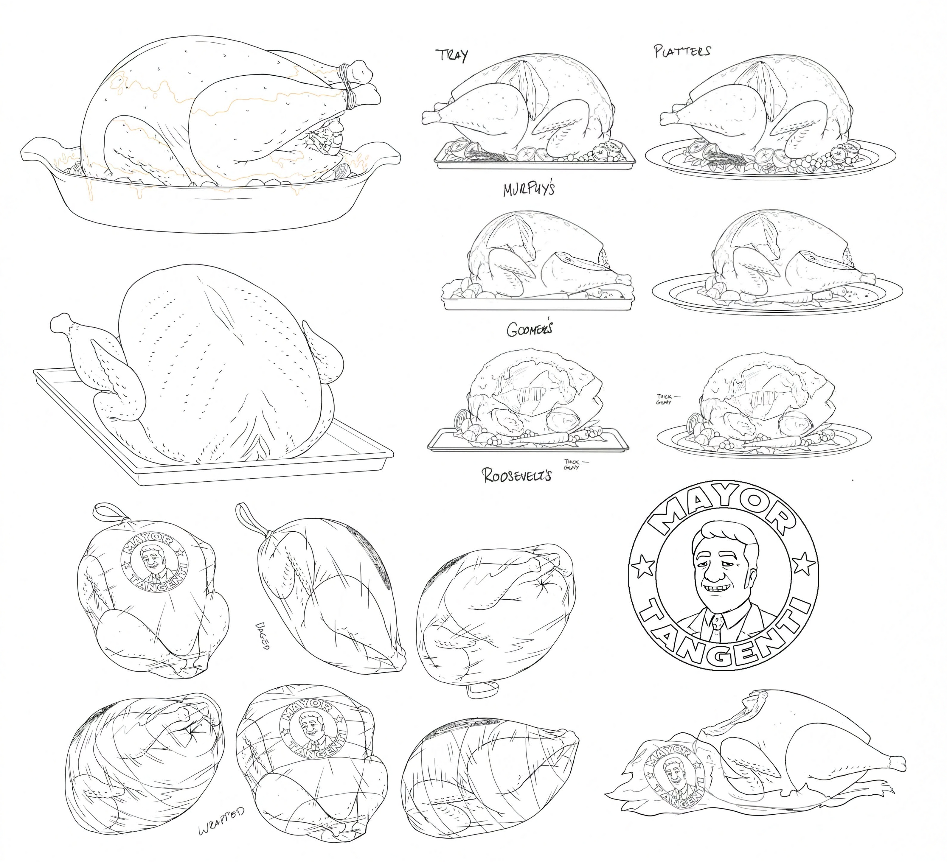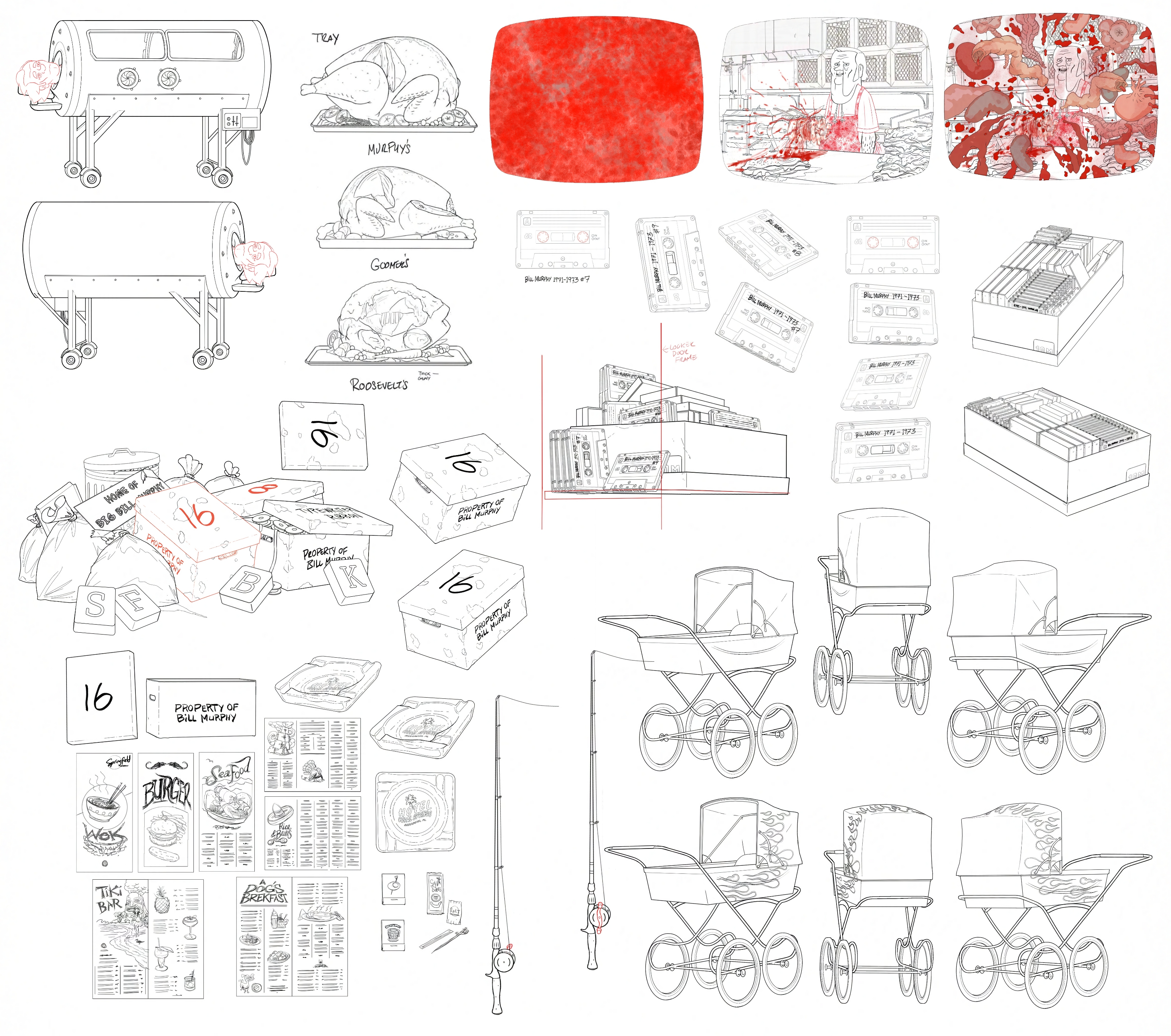 The sheets here are assortments of things done for the 5th final season of the series. Not everything here is the version finally used, most are. But a few are examples of my own favorite bits, things that got cut that I liked, and one is more of a gag I did to play with the director a bit. The actual commercial for Skinny’s was not that gory. Heh!