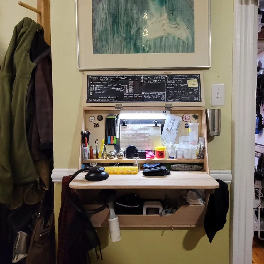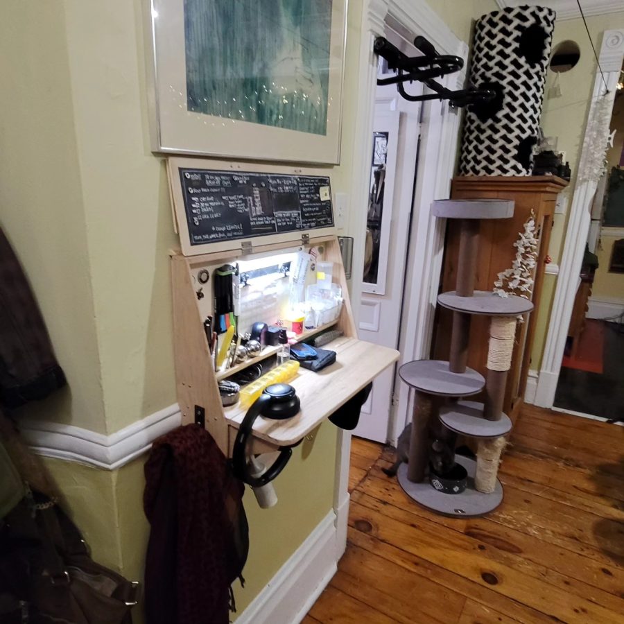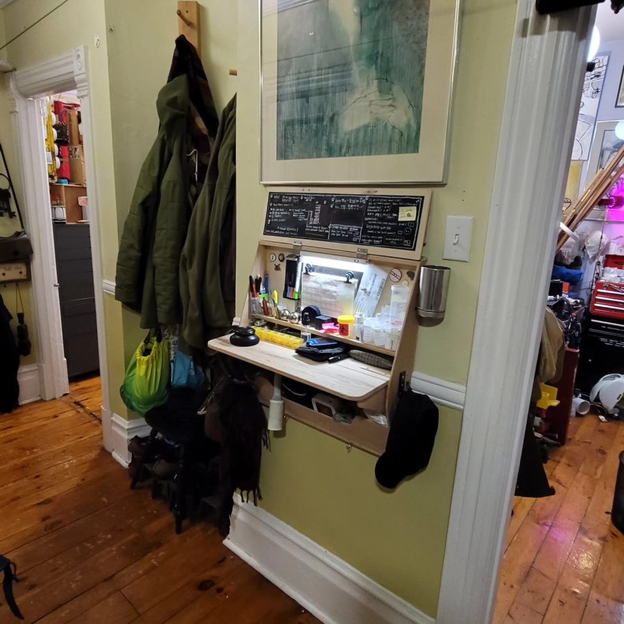 So I needed to set up this in a spot that I’ll see first thing. No room in the bedroom for more stuff, would get lost likely as well between my wife’s and my own clutter. So picked a spot in the middle of the apartment, across from the bathroom, feet from the bedroom but also every other space in the apartment. And designed a wall mounted secretarial style desk/counter/station for the spot. Spent some time over the last two weeks building it.