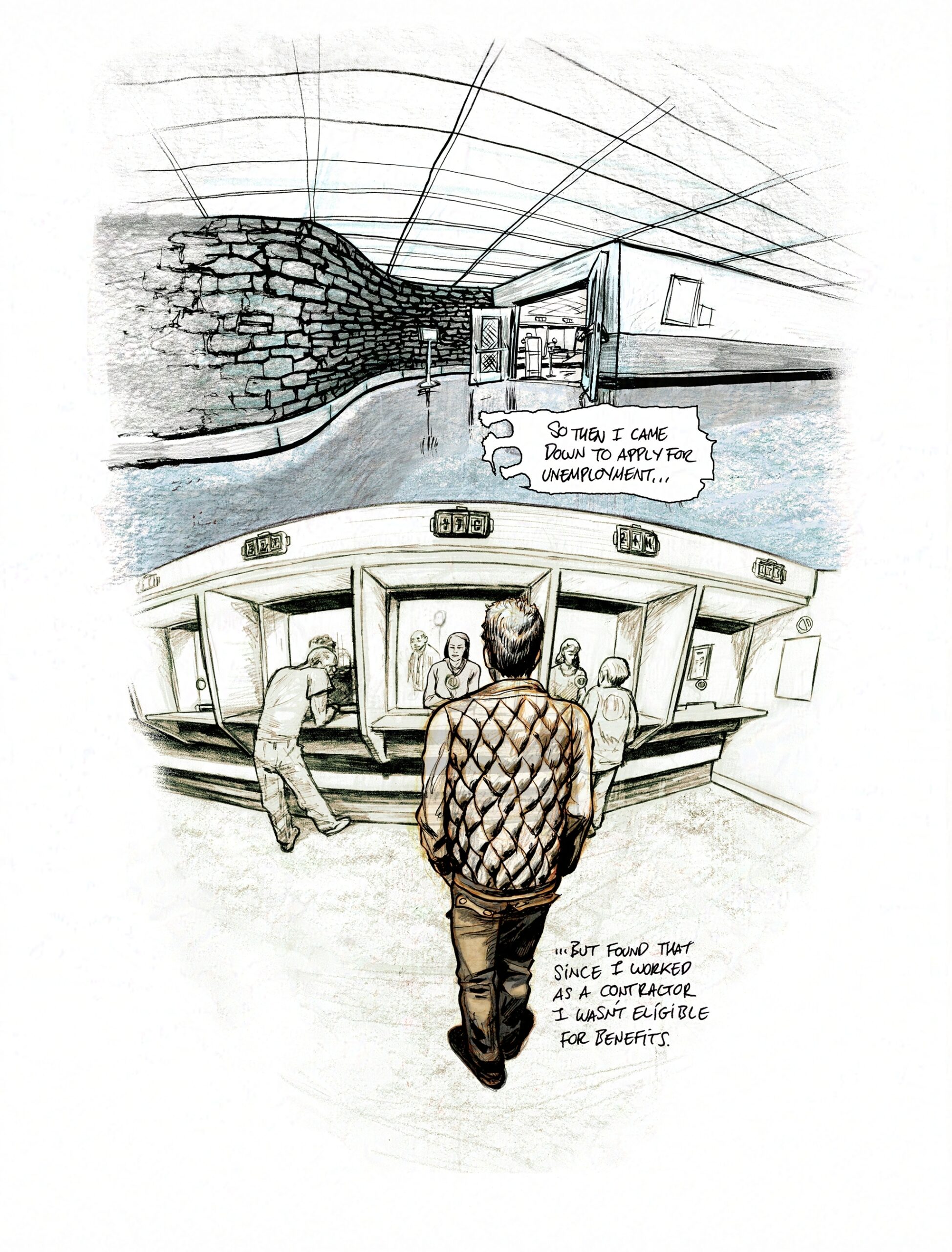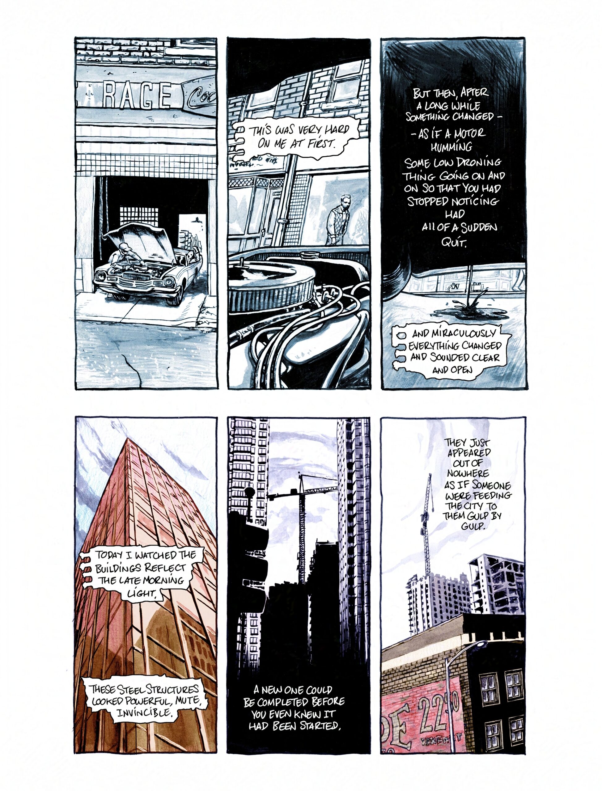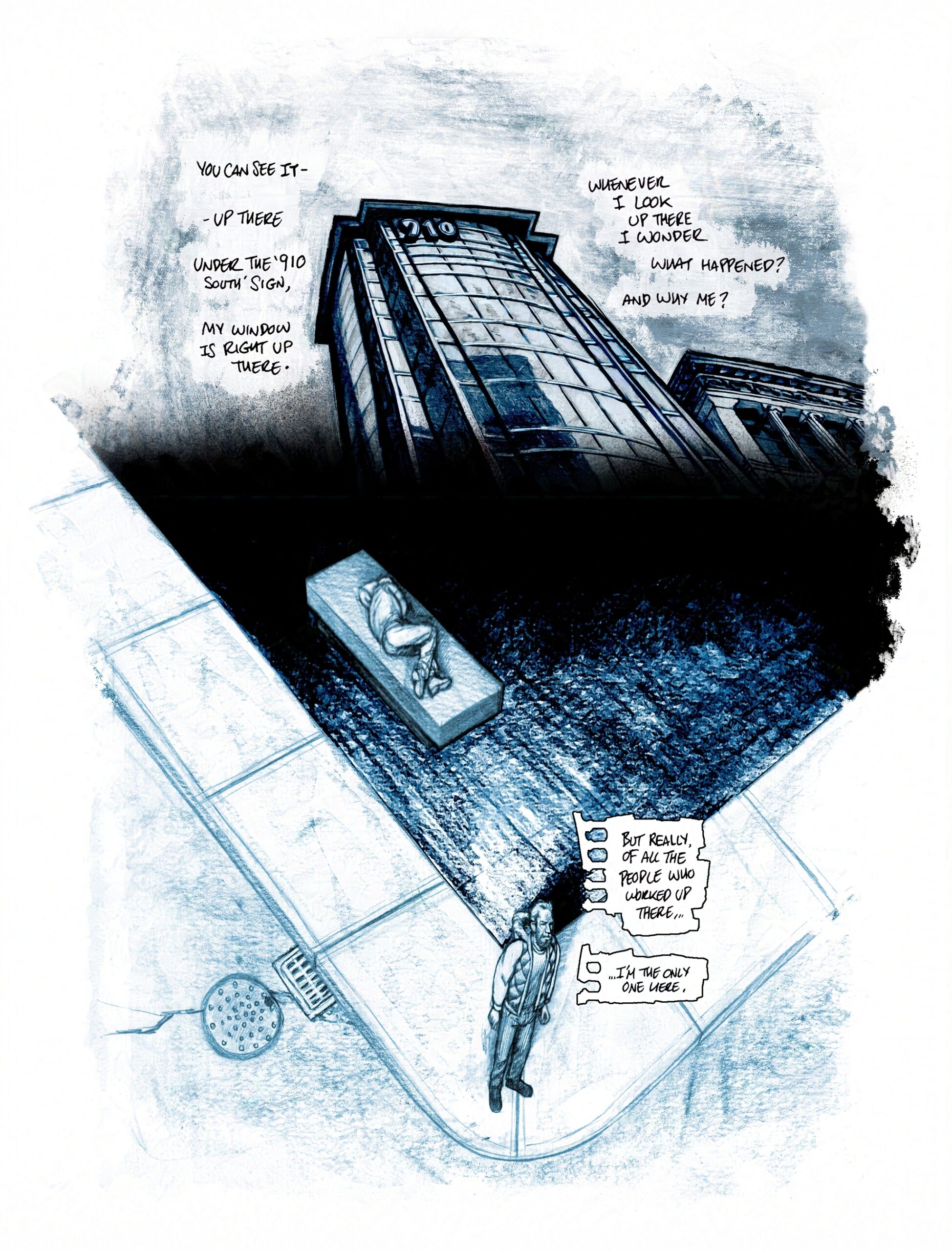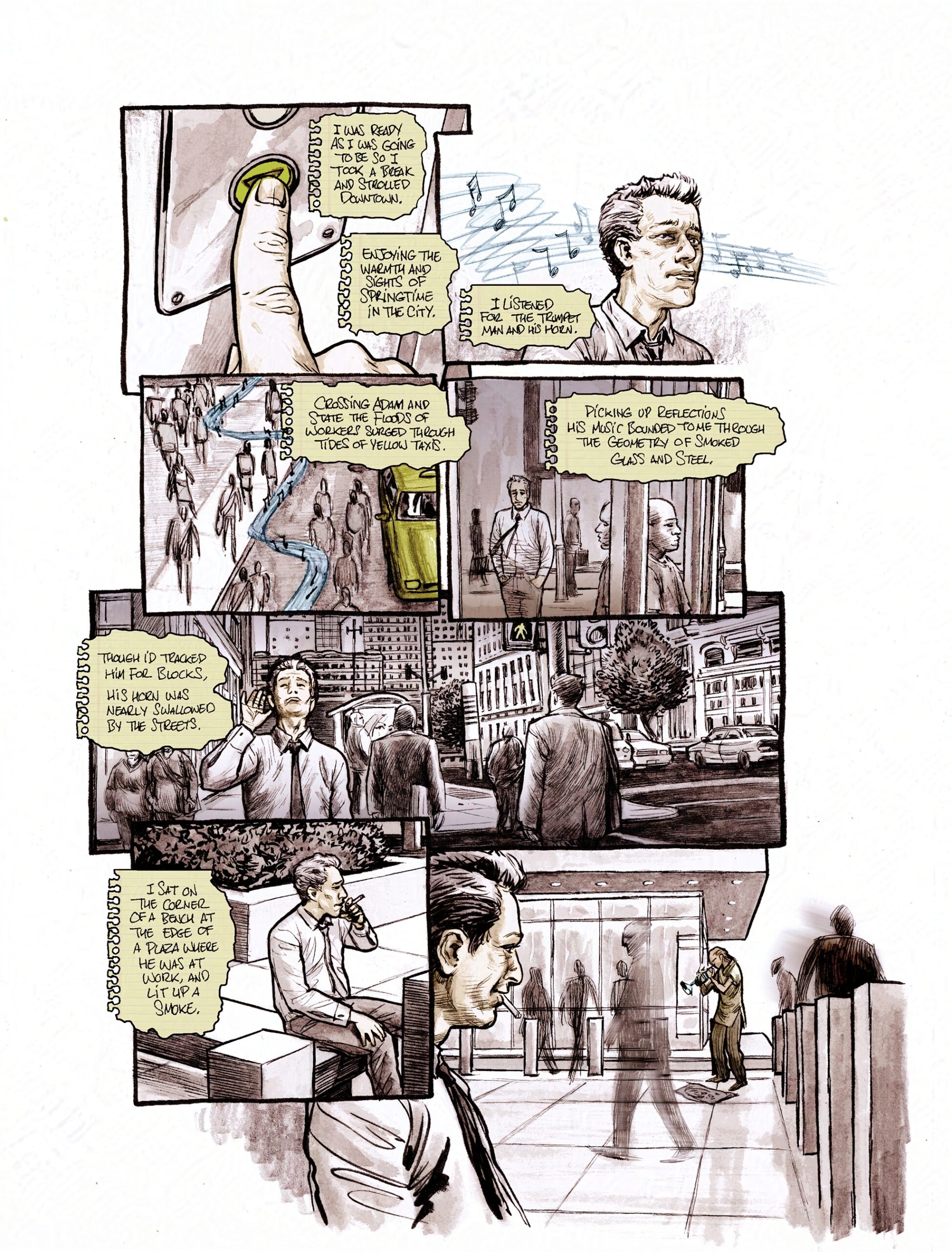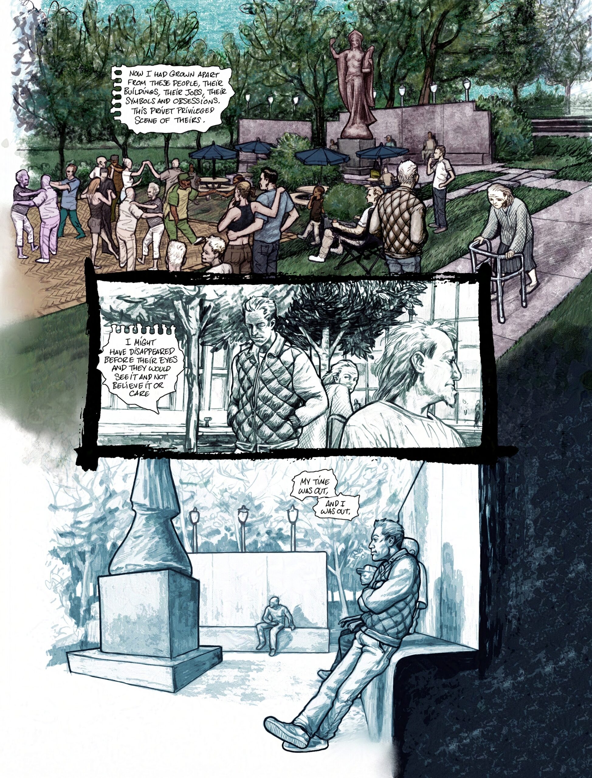 The work is mix media, mostly done in B&W and digitally tinted for colour with some notable exceptions like the first page. I regret in some ways that it was left here, but it works as a short contemplation of class and fortune, in late stage capitalist society.