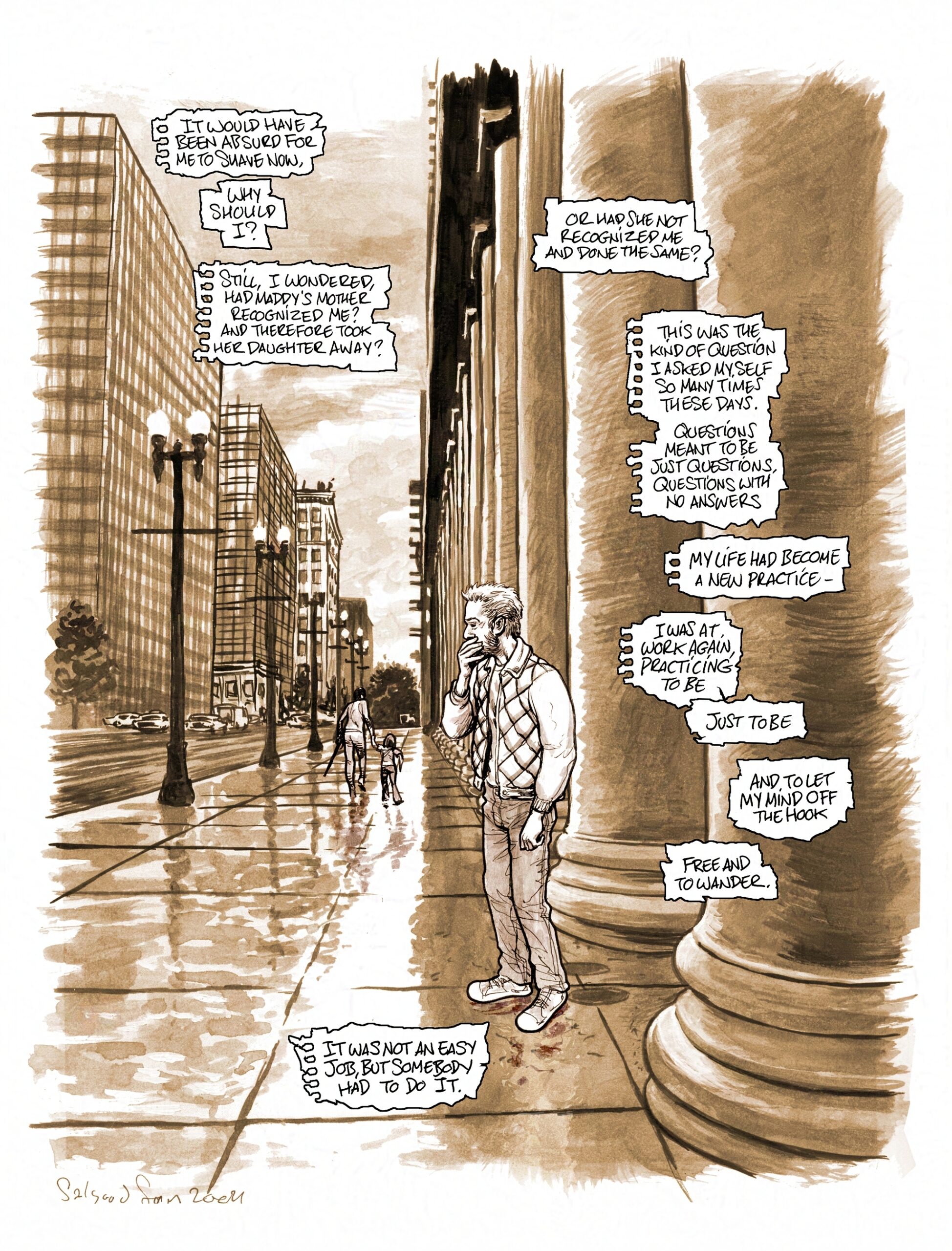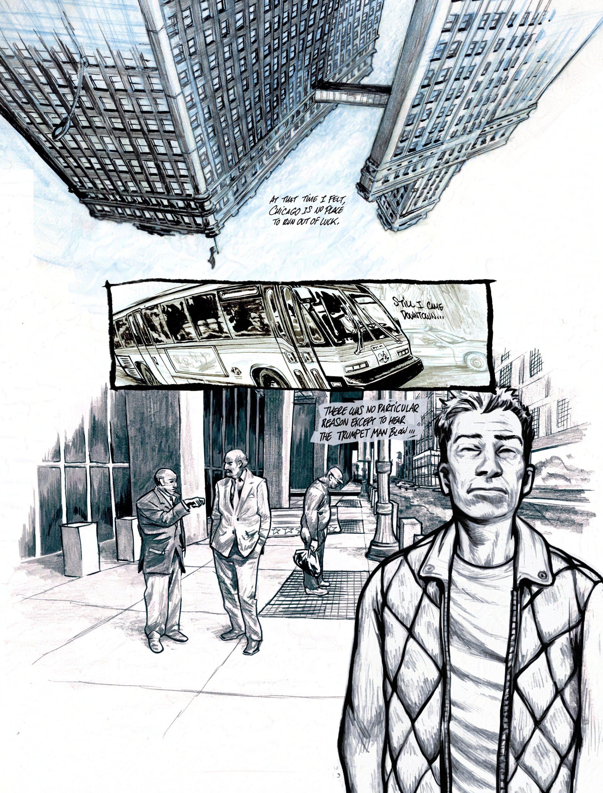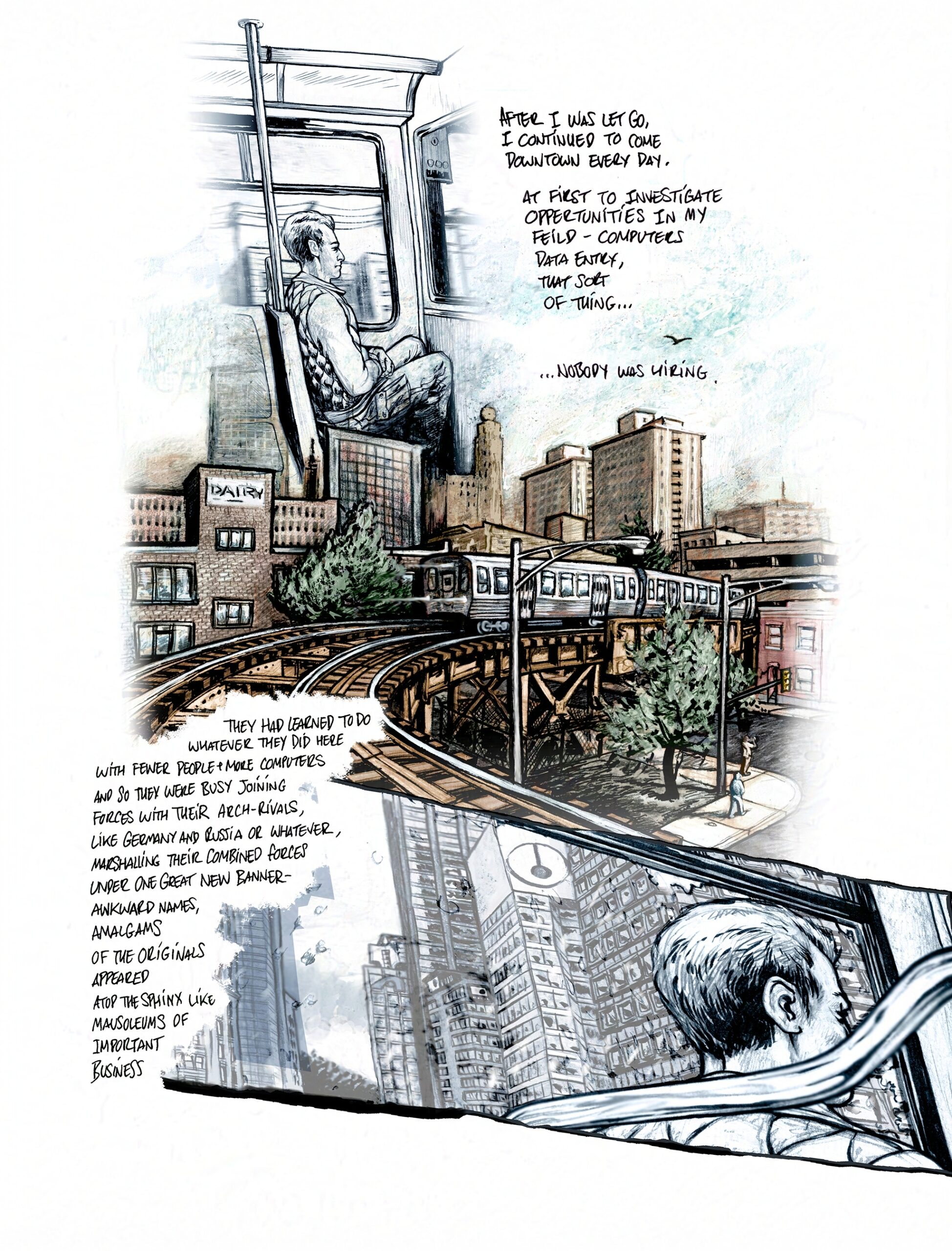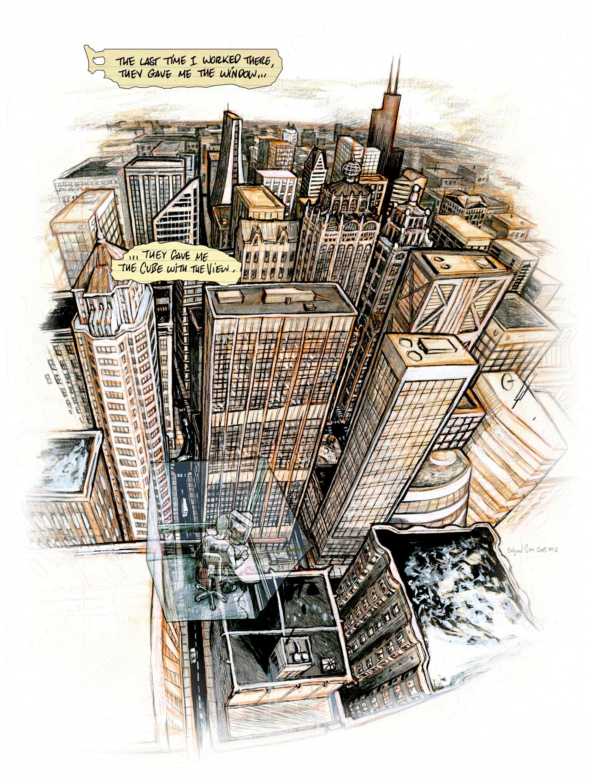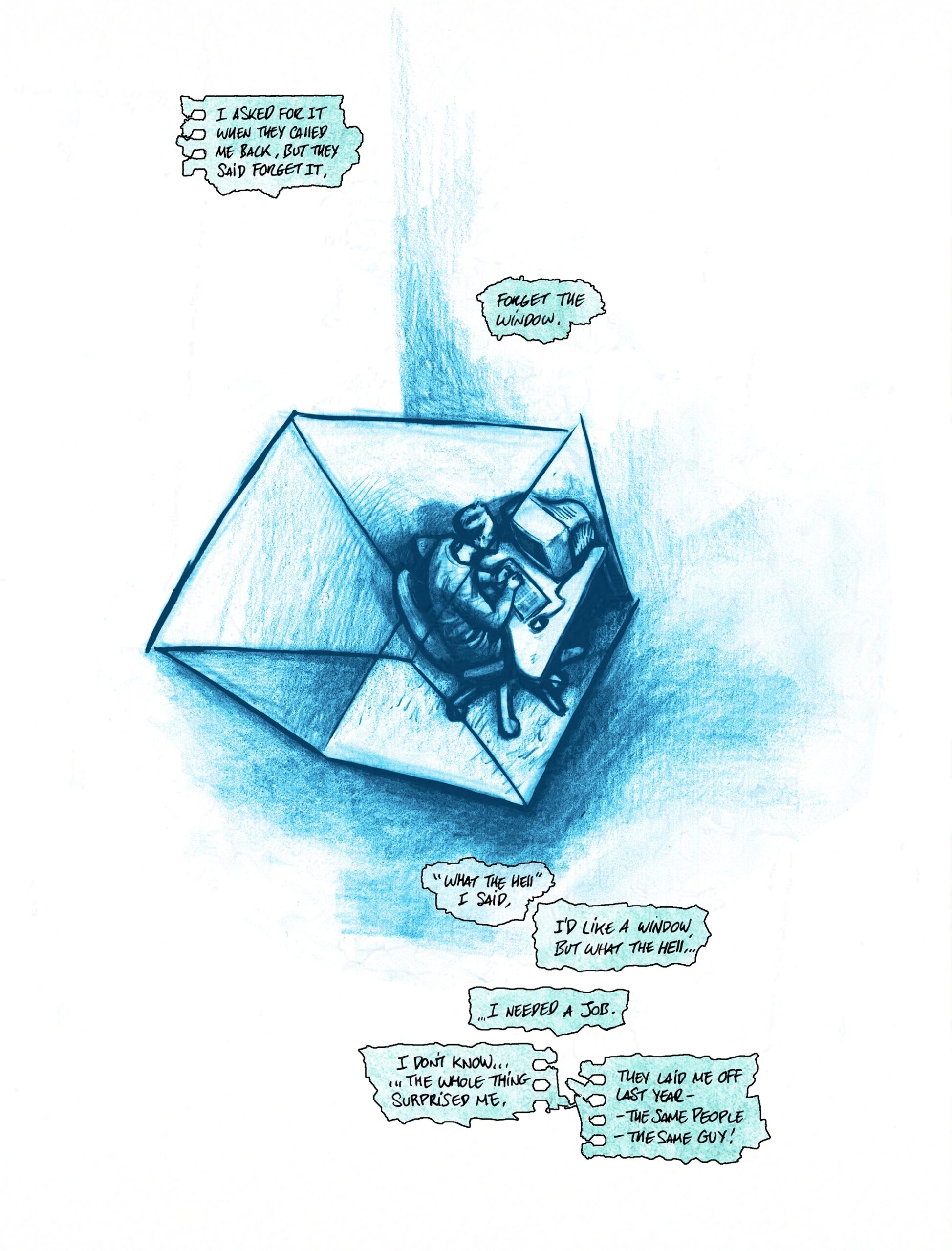 The work is mix media, mostly done in B&W and digitally tinted for colour with some notable exceptions like the first page. I regret in some ways that it was left here, but it works as a short contemplation of class and fortune, in late stage capitalist society.