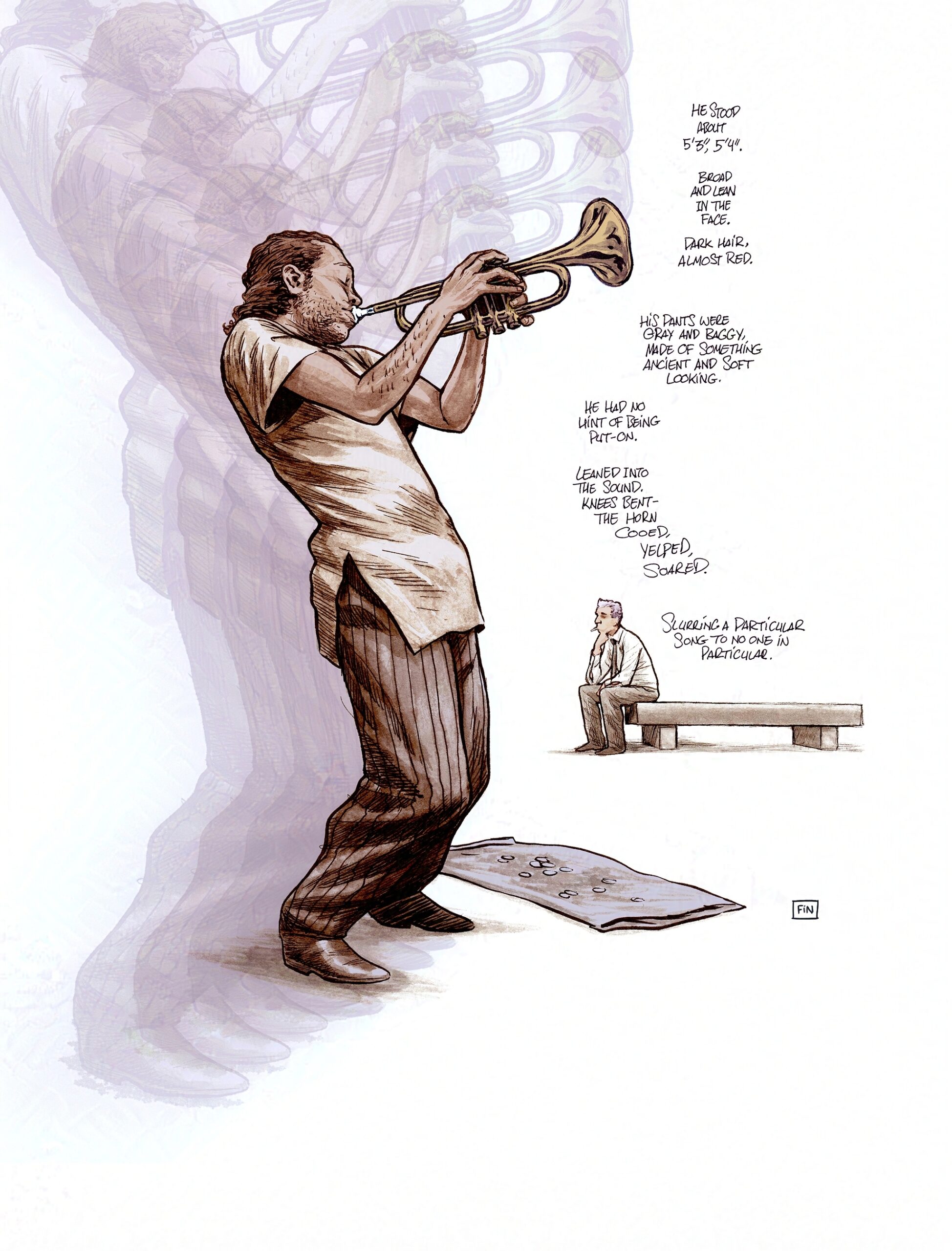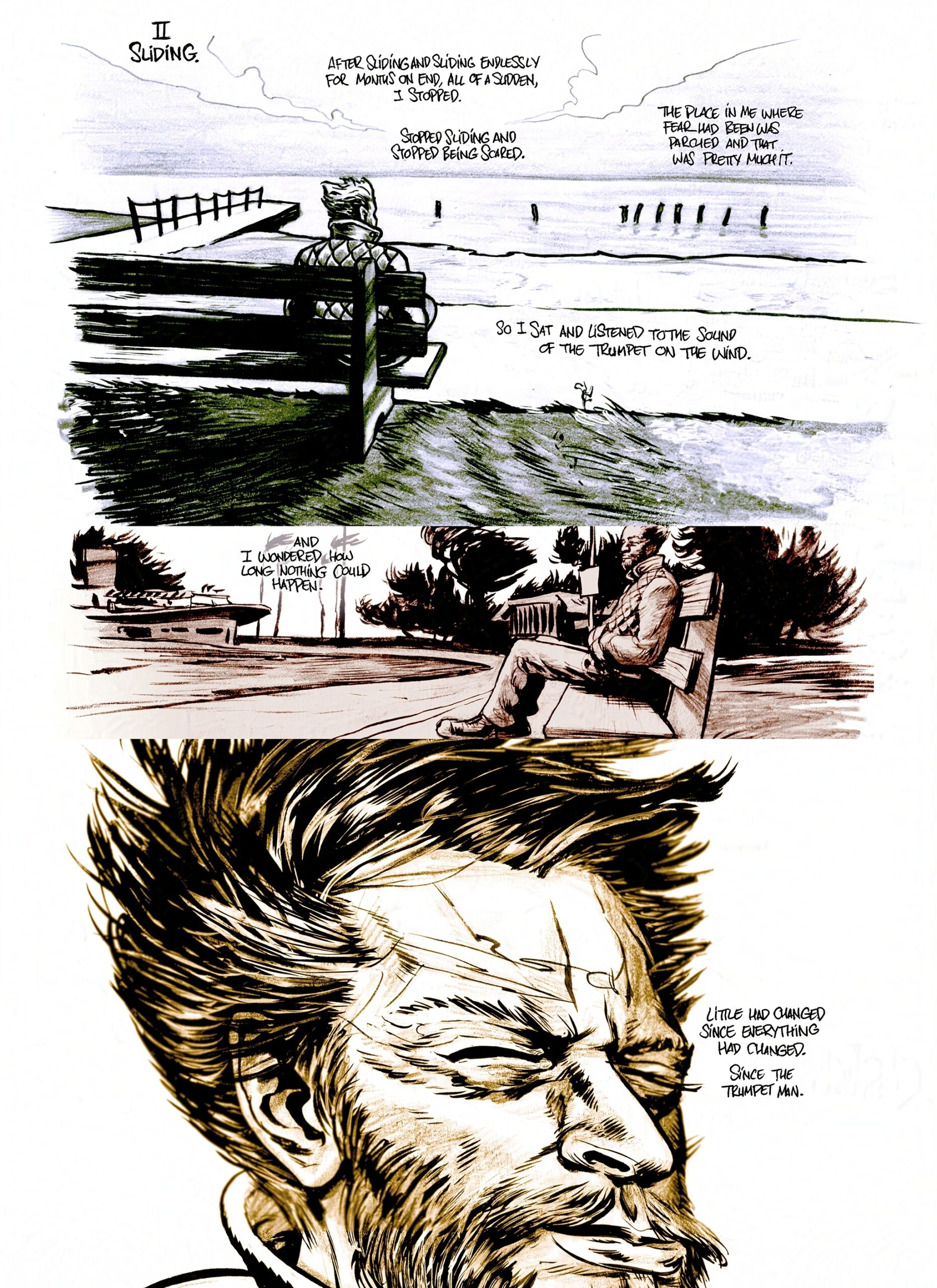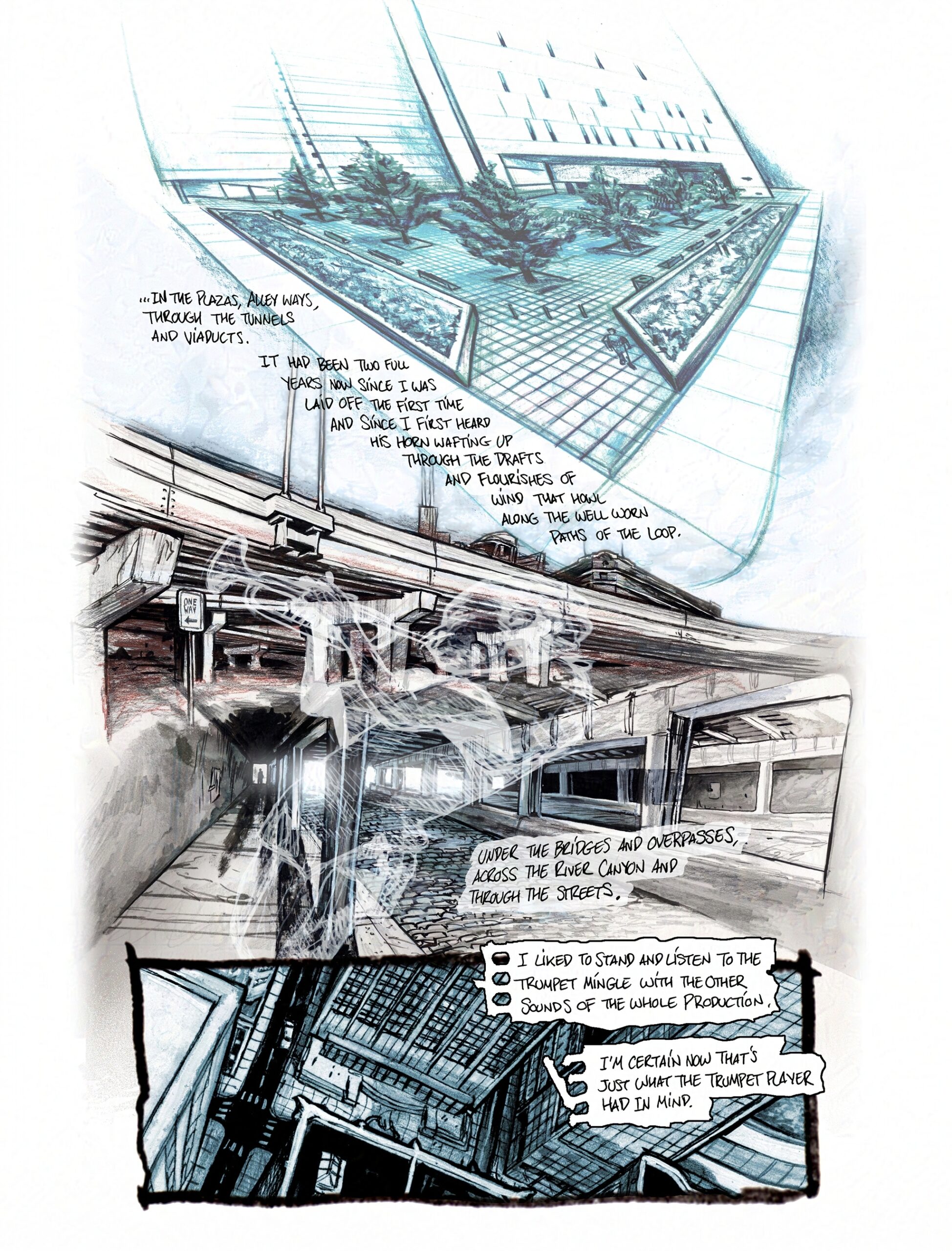 John had also produced a spoken word version of this with both ambient audio and music. His plan was to tour and use the art as a slide show, that we’d produce from the art I also composed into comics pages to publish in print. It was a follow up to a previous experiment he’d done with a noir jazz piece titled “Life at Night”.