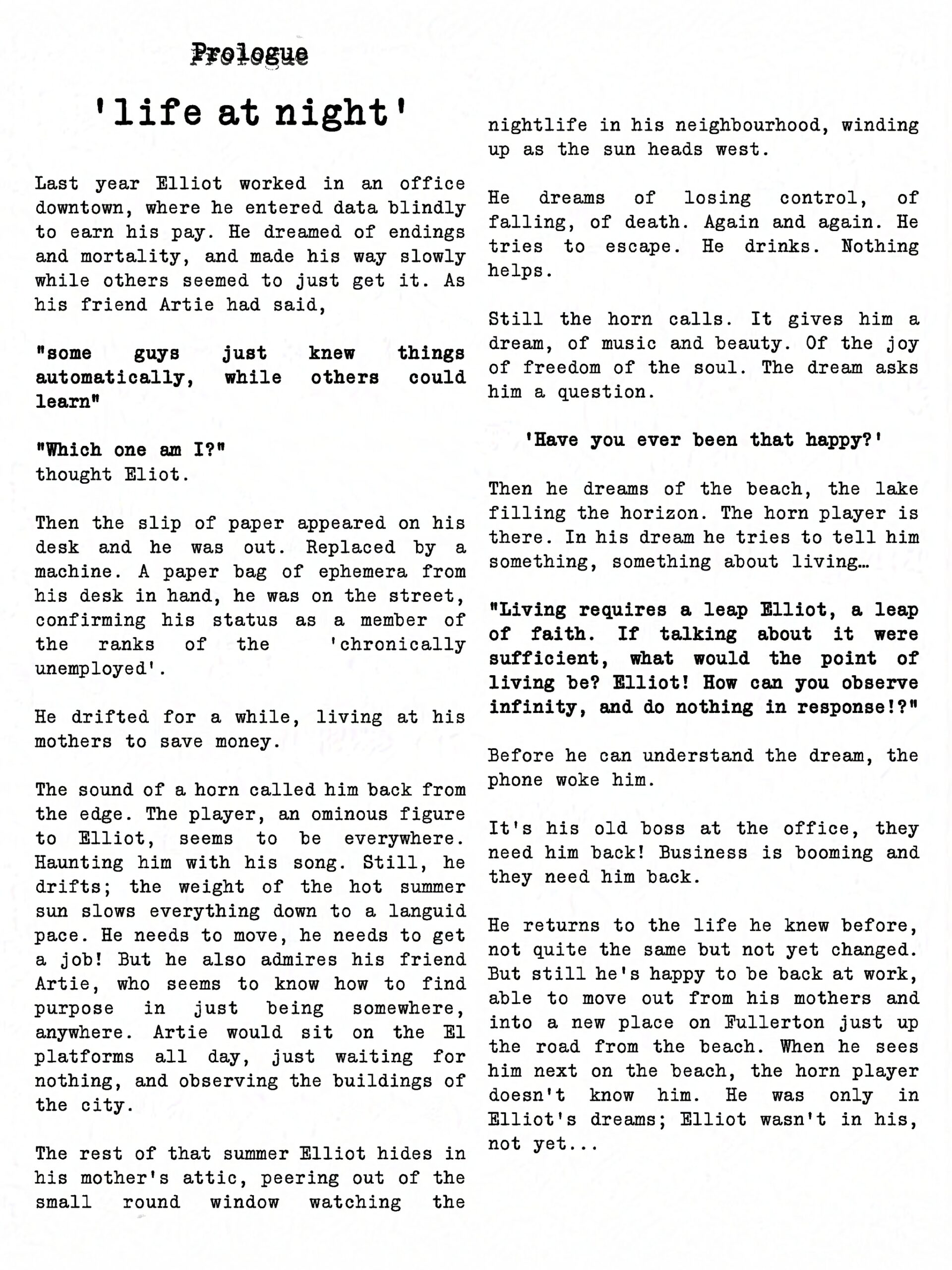 Elliot falls between the cracks and discovers a different pace of life on the streets of Chicago.