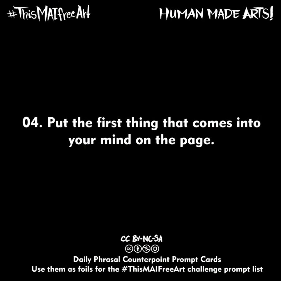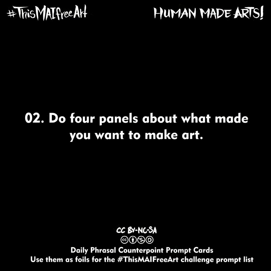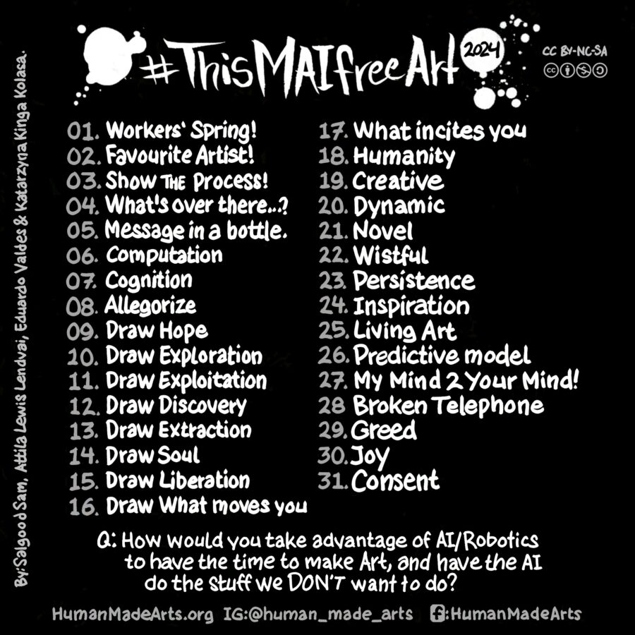 ‘Human Made Arts’ is founded by a group of artists and our tentpole action for May starting with International Workers Day, is a 31 day art challenge! We created prompts to use to inspire some drawing fun, or work in ANY human driven medium. Share the results of yours with the hashtags #ThisMAIFreeArt and #HumanMadeArts along with others like #NoAI.