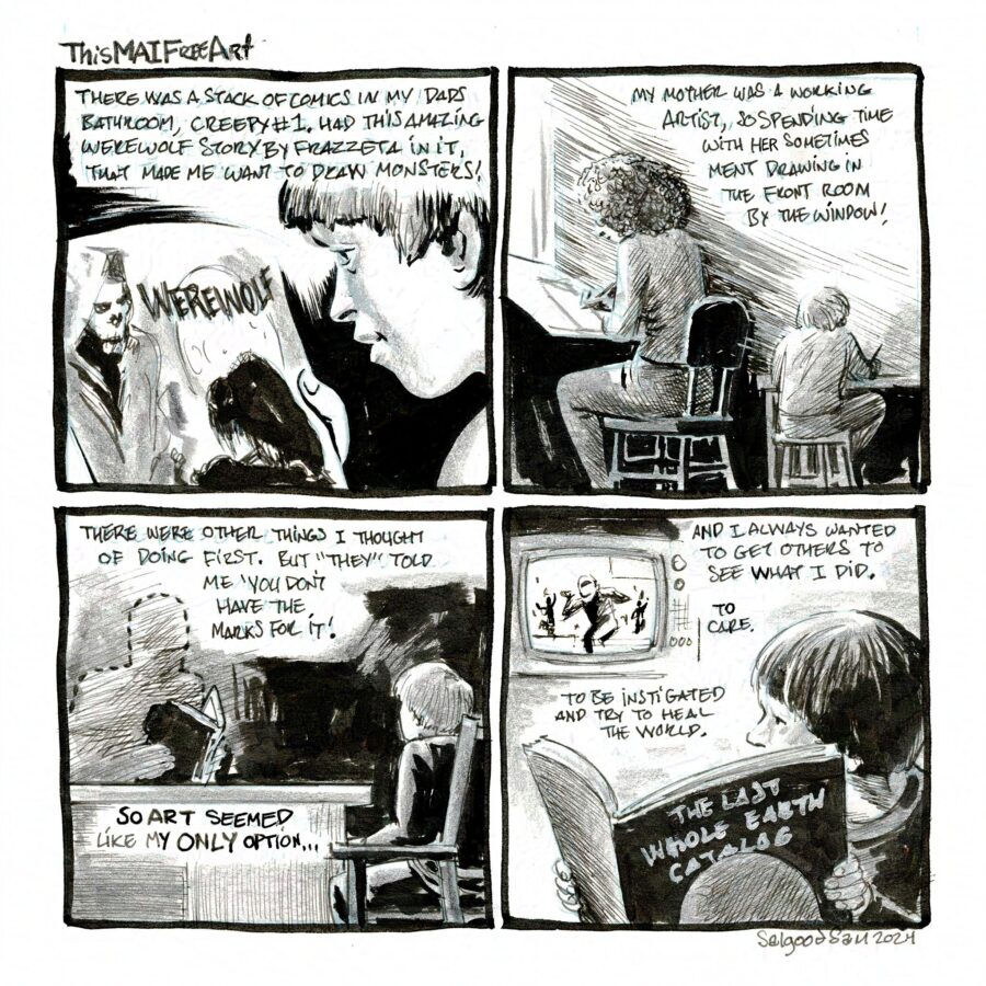 I’ll have my usual at the table: My independent books, prints, and the zines collecting my first 5 days of the #ThisMAIfreeArt stuff too! Hope to see some of you at either of those, come by and say Hi if nothing else!